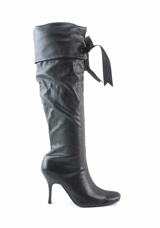 LADIES WOMENS BLACK KNEE BOOTS HIGH HEEL PIRATE STYLE RIBBON CUFF SHOES SIZE