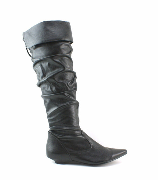 LADIES WOMENS SUEDE KNEE BOOTS LOW FLAT HEEL PULL ON PIRATE STYLE SHOES SIZE